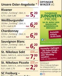 Die Jungweinprobe der Tuniberger Winzergenossenschaften wird auch dieses Jahr wieder beim Badischen Winzerkeller in Breisach stattfinden. Entdecken Sie bei dieser besonderen Weinprobe jetzt schon 15 Weine, insbesondere des Jahrgangs 2025. Genießen Sie dazu warme Speisen vom Buffet, zubereitet vom Fallerhof in Hausen. Durch die Weinprobe führt Sie die Weinprinzessin des Bereichs Kaiserstuhl-Tuniberg Natascha Berwin aus Eichstetten.